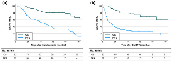 Kaplan-Meier survival curves for (a) OS and PFS rates after the first diagnosis of prostate cancer and (b) OS and PFS rates after OMDRT.
