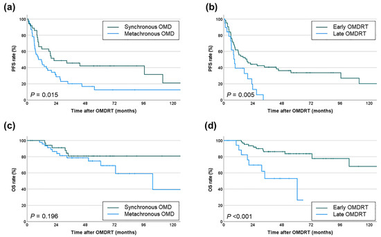 Kaplan-Meier analysis demonstrated that patients with synchronous OMD who underwent OMDRT had significantly higher PFS (median 22.2 months, 2-year 48.7%, 5-year 42.1%) compared to those with metachronous OMD (median 9.4 months, 2-year 28.8%, 5-year 12.6%, p = 0.015). However, there was no significant difference in OS (Figure 3a,c). Furthermore, patients who received early OMDRT exhibited significantly improved PFS (median 19.1 months, 2-year 44.2%, 5-year 33.7%) and OS (median not reached, 2-year 93.5%, 5-year 83.7%) compared to those who received late OMDRT (PFS: median 9.0 months, 2-year 13.1%, 5-year 0%, p = 0.005; OS: median 60.7 months, 2-year 69.7%, 5-year 53.1%, p < 0.001) (Figure 3b,d).