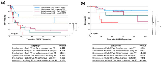 Comparison of (a) PFS and (b) OS rates across subgroups based on the type of OMD and the timing of OMDRT. Statistically significant comparison results are indicated in the figure with an asterisk (*) and bold font for the p values.