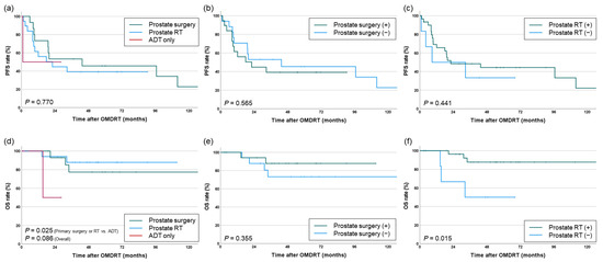 Within the synchronous OMD cohort, no significant differences in PFS were observed based on whether primary prostate treatment was performed (prostate surgery or RT vs. ADT: p = 0.748, overall: p = 0.770). There were also no differences based on whether prostate surgery or PPR was performed (p = 0.565 and 0.441, respectively). However, for OS, patients who received any form of primary prostate treatment had significantly higher survival rates (prostate surgery or RT vs. ADT: 5-year OS 83.1% vs. 50%, p = 0.025, overall: p = 0.770). In particular, the group that received PPR (before or concurrently with OMDRT) demonstrated significantly improved survival (5-year OS 87.7% vs. 50%, p = 0.015) (Figure 5).