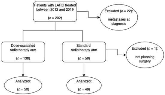 Patients with LARC were evaluated 1:1 to either a standard treatment arm consisting of preoperative chemoradiation (mean of 47.5 Gy) or to a dose-escalated radiotherapy arm (mean of 54.3 Gy), as a CONSORT diagram shows in Figure 1.