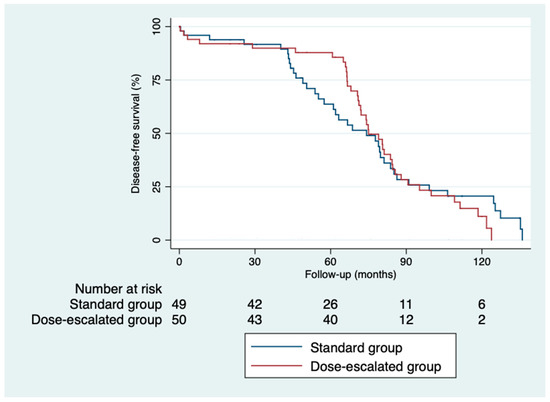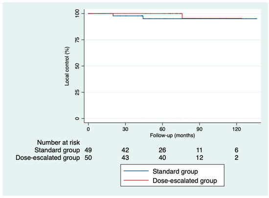 The 5-year disease-free survival was higher in the dose-escalation group than in the standard group (87.6% vs. 64%; p = 0.82), as was the 5-year overall survival (81.6% vs. 74.6%; p = 0.32) (Figure 2 and Figure 3). However, we did not find a benefit in terms of the outcomes, despite achieving higher rates of pathological complete responses with a median follow-up of 5.93 years (IQR: 0.03–11.33). The local control was similar in both groups (Figure 4). Only three local recurrences were documented in the entire series: one in the dose-escalation group, found outside the irradiation field, and two recurrences in the standard group, located within the irradiation field. Nine distant recurrences were reported in each group. Regarding the patients who achieved a ypCR, only two of them died from rectal cancer. Concerning recurrences in the patients with a ypCR, only two patients had a distant recurrence, and none had a locoregional recurrence.