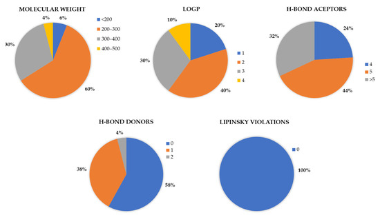 Graphical representation of the variance in the molecular descriptors of molecules retrieved from ChEMBL with activities ranging from 23 nM to 30 µM. The assessed descriptors include molecular weight, Lipinski violations, H-bond donors, H-bond acceptors, and logP. Out of a total of 64 molecules, 50 were used for these graphical analyses.