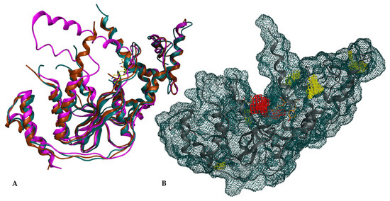 In the initial analysis, the retrieved 3D structures of XPG proteins (Table 1) were aligned and superimposed. Figure 2A shows the overlap of the 6TUR, 6TUX and 6VHB structures. The root mean square deviations (RMSDs) of the structures ranged from 0.67 Å to 1.93 Å, indicating high structural similarity. The overlap revealed significant resemblance, particularly around the putative binding pocket region defined around Lys84, as identified using MOE [49]. The pocket surrounding Lys84 is highly conserved, suggesting its potential as a key site for inhibiting endonuclease activity. In the 6VHB structure, the RMSD spiked to 3.97 Å, and more gaps were observed.