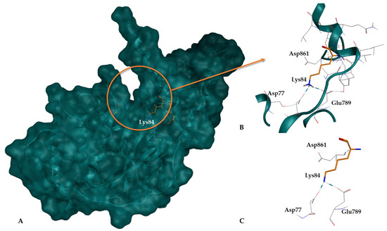 When comparing the two apo structures, 6TUR and 6TUS, it was found that in 6TUR, Lys84 is positioned deeply within the pocket, which is advantageous for docking calculations (Figure 3). In this structure, Lys84 interacts with Asp77, Glu789, and Asp861, forming H-bond interactions. Conversely, in 6TUS, Lys84 is near a gap in the structure (with residue 92 absent), which could mask the 3D conformation, leading to its exclusion.