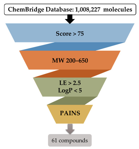 Schematic representation of the filtering criteria applied for compound selection from the ChemBridge database. A total of 1,008,227 molecules were subjected to docking (individually) and scored to find the top 5000 molecules. They were then selected for further filtration using the specified criteria and, consequently, 61 compounds were proposed for acquisition.