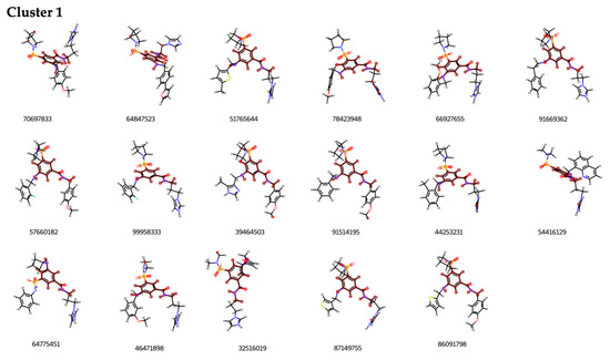 The clustering process applied revealed 48 distinct clusters. Clusters 1 and 2, which featured the most prevalent scaffolds, were the most populated, each containing 17 and 13 structures, respectively (see Figure 5). This analysis highlighted the presence of different substituents on a shared scaffold within each cluster. The high number of clusters, each with a relatively small number of molecules, underscores the molecular diversity among potential XPG inhibitors. Each cluster’s molecules were visually inspected to determine their positioning within the binding pocket, which then guided the selection of compounds.
