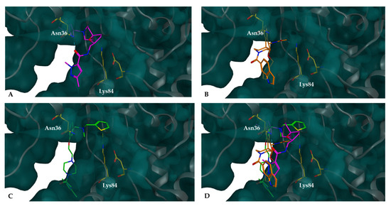 Compounds docked into the binding pocket of the XPG protein are represented as follows: XPG highlighting the Lys84 and Asn36 residues inside the binding pocket; (A) docked complexes of XPG with potential inhibitor CB41-G (purple), (B) docked complexes of XPG with potential inhibitor CB60-G (orange), (C) docked complexes of XPG with potential inhibitor CB22-G (green), and (D) overlap of the three small molecules. All these molecules fit snugly within the pocket, effectively blocking access to the top of the cavity.