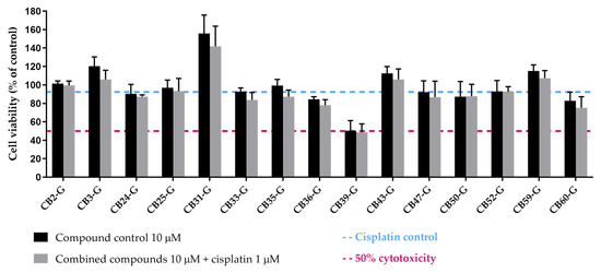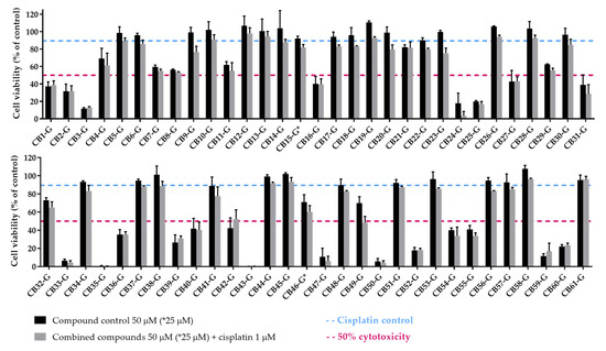 After the selection of the most suitable cellular model and acquisition of the proposed XPG inhibitors, a first screening approach was performed by assessing if the inhibitors could enhance cisplatin-induced cytotoxicity. A similar methodological approach was conducted as described in Manguinhas et al. [39]. An MTS reduction assay was also selected to measure cell viability in the H1299 cell line after exposure to 1 µM of Cisplatin and 50 µM of each putative inhibitor for 72 h (25 µM for CB16-G and CB46-G inhibitors due to solubility issues). Figure 9 presents the results for all putative inhibitors selected from the ChemBridge database.