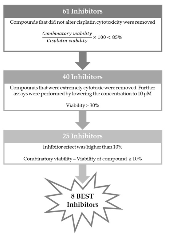 From the screening at 10 µM of the extremely cytotoxic 15 compounds (Figure 10), only CB60-G emerged as a promising compound to boost cisplatin cytotoxicity. Based on this assessment, CB60-G was evaluated with the same criteria proposed in Figure 11, and later selected among the pool of best inhibitors, totaling eight best inhibitors for further evaluation. The chemical structures of the eight best inhibitors are present in Supplementary Materials, Figure S1.