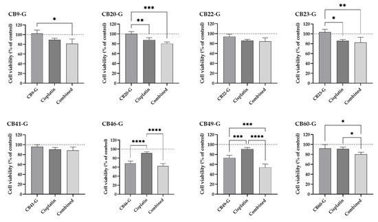 Effect of the 8 best inhibitors in sensitizing H1299 cells to cisplatin-induced cytotoxicity. The MTS assays was performed as a measure of cell viability and all the compounds (CB9-G, CB20-20, CB22-G, CB23-G, CB41-G, CB49-G at 50 µM; CB46-G at 25 µM; CB60-G at 10 µM) were applied to the cells in combination with cisplatin (1 µM) for 72 h. Values represent mean ± SD and are expressed as percentages of the solvent-treated control cells considered as 100% of cell viability, identified as the dotted line in the graphs (n = 3–5). * p < 0.05, ** p < 0.01, *** p < 0.001, and **** p < 0.0001 (one-way ANOVA, Tukey’s multiple comparisons test).