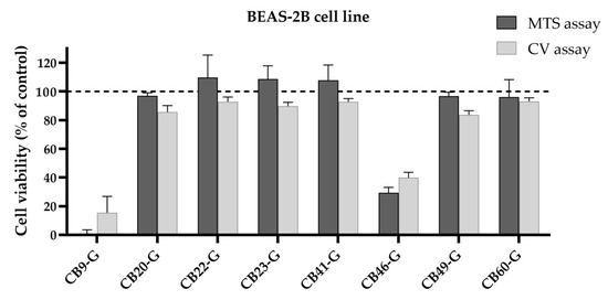 Cytotoxicity of the 8 best inhibitors in BEAS-2B cells. Cell viability was assessed in the BEAS-2B cell line using the MTS reduction and the CV staining assays by incubating each compound for 72 h (CB9-G, CB20-20, CB22-G, CB23-G, CB41-G, CB49-G at 50 µM; CB46-G at 25 µM; CB60-G at 10 µM). Values represent mean ± SD and are expressed as percentages of the solvent-treated control cells considered as 100% of cell viability, identified as the dashed line in the graph (n = 2–3).