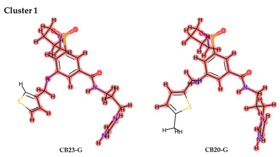 Representation of cluster derived from the final data set of 8 molecules proposed as inhibitors. Between the 8 molecules, only 2 were sufficiently similar to be considered as a cluster. Parts of the molecules highlighted in red represent the similar scaffold that defines each cluster.
