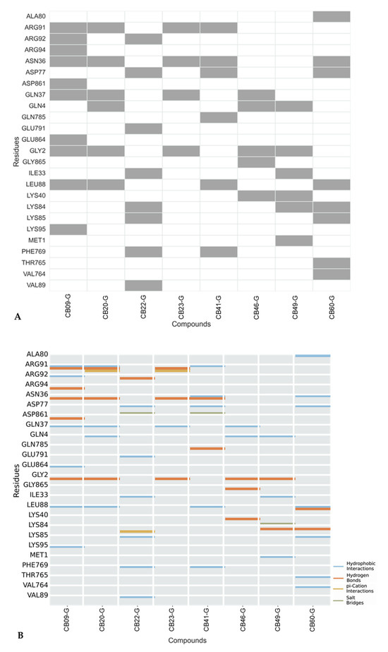 (A) XPG residues interacting with the top 8 compounds. Rows represent specific XPG residues, and columns represent active compounds from virtual screening. Grey Squares indicate ligand–receptor interactions, while the white squares indicate no interactions. (B) Interaction types between XPG protein and active compounds from virtual screening. Rows represent XPG residues and columns represent the 8 active molecules. The analysis considered H-bonds, hydrophobic interactions, π-stacking, water bridges, halogen bonds, and salt bridges. No water bridges or π-stacking interactions were identified.