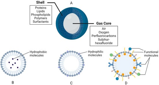 General composition of nanobubbles (NBs). (A) General structure and composition. (B) Example of a hydrophobic region in a lipid-based shell. (C) Example of a hydrophilic region in a lipid-based shell. (D) Functional molecules, such as polymers, surfactants, antibodies, binding ligands, etc., attached and/or embedded in the shell membrane. The figure was created with BioRender.com.