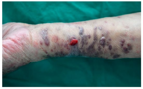 Two years later, the progression of untreated lesions led to the development of painful and bleeding symptoms, prompting the patient to seek medical care again. Owing to financial constraints, the patient declined further diagnostic tests and systemic treatment, opting instead for localized RT targeting symptomatic areas. These lesions recurred within the previous RT field after 52 months (Figure 1). RT with 25 Gy in 10 fractions was administered to both forearms, resulting in a PR. The re-irradiated lesions remained in the PR state for 7 months.
