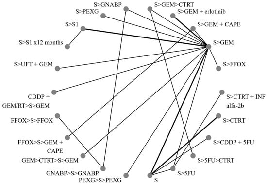 The SUCRA probabilities for the best treatment were 1 for adjuvant S1; 0.96 for perioperative PEXG; 0.95 for perioperative GEM + nab-paclitaxel; 0.95 for adjuvant S1 for 12 months; 0.92 for perioperative FOLFIRINOX and adjuvant GEM + nab-paclitaxel; 0.87 for adjuvant FOLFIRINOX and adjuvant GEM + CAPE; 0.88 for adjuvant GEM + nab-paclitaxel; and 0.69 for neoadjuvant GEM + CTRT. Other treatments were associated with lower SUCRA probabilities, as follows: neoadjuvant FOLFIRINOX followed by surgery and other adjuvant CT (0.09); surgery alone (0); adjuvant 5-fluorouracil (0.09); adjuvant 5-fluorouracil followed by CTRT (0.25); adjuvant cisplatin + 5-fluorouracil (0.07); adjuvant CTRT (0.003); adjuvant CTRT + interferon-alpha2b (INF-alfa2b) (0.27); adjuvant GEM (0.09); adjuvant GEM + erlotinib (0.12); adjuvant GEM followed by CTRT (0.36); and adjuvant tegafur–uracil (UFT) + GEM (0.05).