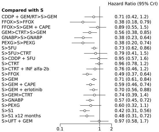 Forest plot of various treatment arms compared with surgery alone arm. S, surgery; CT, chemotherapy; RT, radiotherapy; CDDP, cisplatin; GEM, gemcitabine; FFOX, FOLFIRINOX; CAPE, capecitabine; GNABP, gemcitabine + nab-paclitaxel; PEXG, cisplatin + epirubicin + capecitabine + gemcitabine; 5FU, 5-fluorouracil; IFN, interferon; ERLO, erlotinib; UFT, tegafur–uracil; >, followed by.