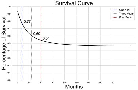 Figure 2 shows a survival curve indicating the percentage of survival over time in months. The survival rates at one year, three years, and five years are highlighted on the graph, along with specific survival percentages at those time points. At one year, the survival rate is around 77%, at three years, it drops to 60%, and at five years, the rate is approximately 54%.