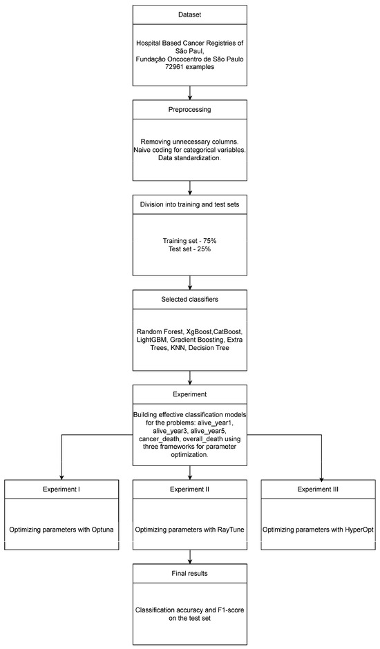 Eight widely used and validated classifiers were used: Random Forest, XGBoost, CatBoost, LightGBM, Gradient Boosting, Extra Trees, KNN, and Decision Tree. A key aspect of the experiment was the optimization of parameters using three frameworks: Optuna, RayTune, and HyperOpt. Classification accuracy and F1-score were used as primary metrics, calculated in the test set. Detailed descriptions of the individual components of the experiment can be found in the Section 2.1, Section 2.2 and Section 2.3.