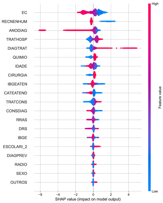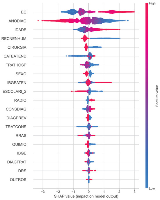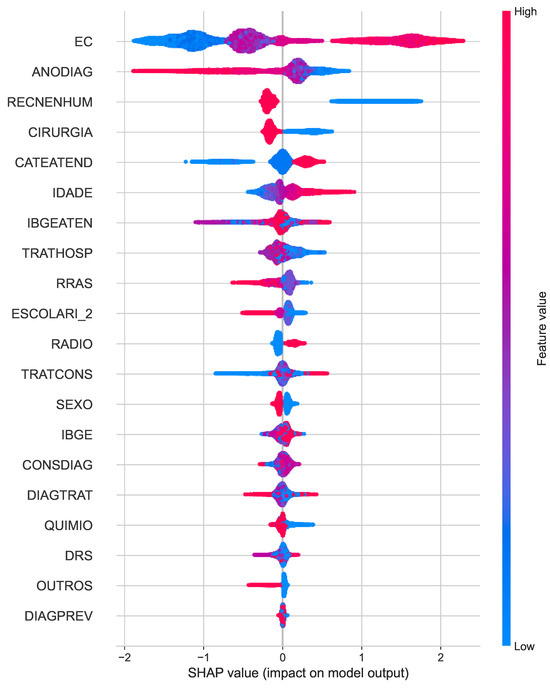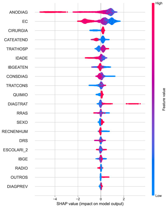 Similarly, the SHAP summary plot for cancer death (Figure 5) reveals clinical staging (EC) as the dominant predictor, along with year of diagnosis (ANODIAG) and treatment-related factors such as chemotherapy (QUIMIO) and radiotherapy (RADIO). The distributions of the SHAP values provide insight into how these characteristics influence the predicted risk of cancer-specific mortality.