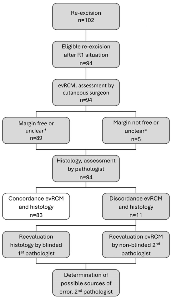 Study procedure; * during the analysis, evRCM findings assessed as unclear were evaluated according to their surgical consequence. Concordant findings in evRCM and histology (white colour) were not re-evaluated.