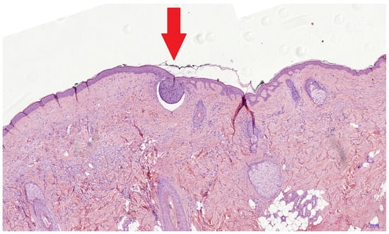 This histological image shows a superficial BCC nest with a diameter of 0.3 mm (red arrow). It is possible that such tumor remnants are not present in the true surgical margin and cannot be seen using evRCM. The histological findings might be false positive due to sectioning of the re-excised specimen.