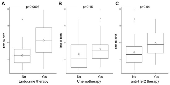 Time to the first birth (years) in BC survivors according to treatment type. Breast cancer patients were stratified by the following treatment types: (A) endocrine therapy, (B) chemotherapy, and (C) anti-Her2 therapy. Box plots represent the median with interquartile range. The mean is shown as rhomb. Whiskers indicate minimum and maximum. Individual dots show outliers.