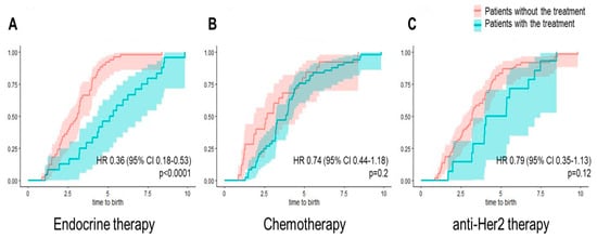 Cumulative incidence of the first birth in BC survivors according to treatment type. Breast cancer survivors with a postdiagnosis birth stratified by endocrine therapy (A), chemotherapy (B), and anti-Her2 treatment (C). Hazard ratios with 95% CI are shown.