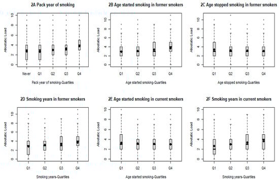 Our final analysis further investigated the association between various smoking-related factors and AL (Table 4). As expected, all analyzed smoking-related variables, including smoking status, pack-years of smoking among all study participants, age of smoking initiation, and years of smoking among former and current smokers, respectively, and age of smoking cessation among former smokers, were significantly associated with levels of AL (p < 0.001, respectively). Additionally, a significant trend of increasing AL was observed for changing smoking status from never or former to current (p < 0.001) and increasing pack-years from never to the highest quartile (p < 0.001) (Figure 2). A similar trend was also observed for increasing years of smoking among both former and current smokers and increasing age of smoking cessation among former smokers (p < 0.001, respectively). On the other hand, a significant trend of increasing AL was observed for increasing age of smoking initiation (p < 0.001).