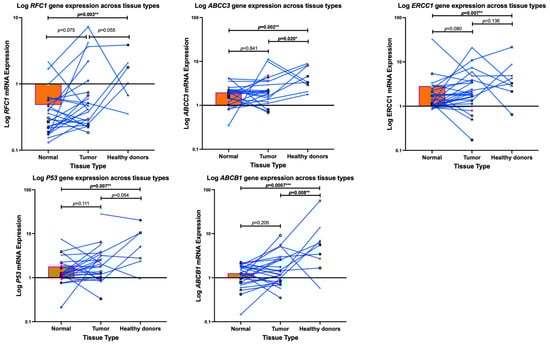 Using a Mann–Whitney test, we observed a significant downregulation in the mRNA expression levels of ABCC3, ABCB1 (p-glycoprotein), ERCC1, p53, and RFC1 of COS patients compared to the healthy donors as measured by RT-PCR (p = 0.002; p = 0.0007; p = 0.007; p = 0.007; and p = 0.003), respectively—Figure 2. Furthermore, the mRNA expression levels of ABCC3 (p = 0.020) and ABCB1, also known as p-glycoprotein (p = 0.008), exhibited a significant downregulation in the tumour tissues of COS patients tumour when compared to the healthy donors. This is in contrast to the clear but non-significant upregulation in ERCC1 (p = 0.080) and RFC1 (p = 0.075) between the tumours and normal muscle tissue of the COS patients. Meanwhile, ABCB1, ABCC3, and p53 remained non-significant (p = 0.205; p = 0.841; p = 0.111, respectively).