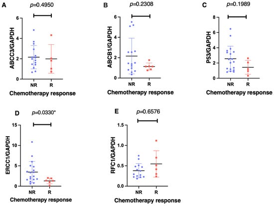 Using an unpaired Mann–Whitney two-tailed analysis, only the ERCC1 gene was significantly associated with the chemotherapy response (p = 0.033) when comparing the non-responders against responders (Figure 3). The non-responders showed a mean 4.2-fold increase (95% CI −7.862 to –0.517) in ERCC1 gene expression levels. In contrast, we found no significant differences in the mRNA expression levels between the responders and non-responders for ABCC3 (p = 0.495), ABCB1 (p = 0.231), p53 (p = 0.199), and RFC1 (p = 0.658).
