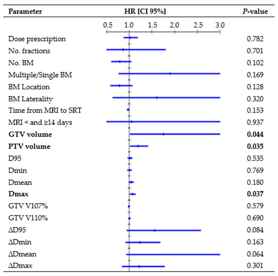 Figure 2 presents all parameters tested in the UVA for LP. One-year rates, divided per D95 interquartile ranges, were as follows: 88.8% for Q1 (23.9–52.7 Gy), 89.1% for Q2 (52.7–62.5 Gy), 89.5% for Q3 (62.6–67.4 Gy), and 90.6% for Q4 (67.4–73.1 Gy). GTV volume (hazard ratio (HR), 1.47, CI 95%: 1.004–1.958; p = 0.009) and Dmax (HR, 1.09, CI 95%: 1.018–1.171; p = 0.014) remained significant risk factors in the MVA. The median volume was 0.18 cc for lesions that did not recur and 0.91 cc for lesions that recurred (K-wallis, p = 0.002). One-year rates, divided per volume interquartile ranges, were as follows: 100% for Q1 (0.01–0.08 cc), 95.8% for Q2 (0.08–0.21 cc), 90.6% for Q3 (0.23–0.87 cc), and 73.0% for Q4 (0.88–8.77 cc). The median Dmax was 69.8 Gy for lesions that did not recur and 70.5 Gy for lesions that recurred (K-wallis, p = 0.420). One-year rates, divided per Dmax interquartile ranges, were as follows: 90.5% for Q1 (37.7–59.1 Gy), 91.1% for Q2 (59.3–69.8 Gy), 84.5% for Q3 (70.0–73.8 Gy), and 86.3% for Q4 (73.8–80.8 Gy).