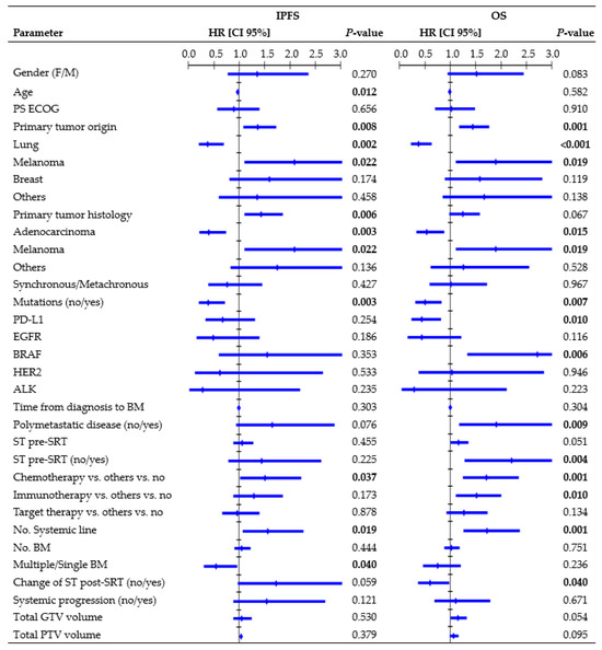 Primary tumor histology, genetic mutations, systemic line number, and ST change after SRT were found to be significantly associated with IPFS and OS in our MVA. Moreover, patients with polymetastatic disease had a significantly inferior OS and a trend towards inferior IPFS compared to patients with less advanced and widespread cancer (Figure 3). This finding emphasizes that interventions for BM may offer limited advantages in terms of preventing IP and improving OS, because these outcomes are often influenced by extracranial factors [12,24,30,38]. Barillaro et al. [38], in a population of 87 patients with 220 BM, found that extracranial disease status was the only factor independently related to OS in the MVA (HR, 1.80; CI 95%: 1.020–3.140, p = 0.043). Likewise, in another study [33] involving 172 patients with 1079 BM, uncontrolled systemic disease (p = 0.000) and melanoma histology (p = 0.026) were identified as independent poor prognostic factors for IPFS.