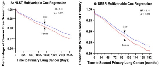 Background/Objectives: Non-small cell lung cancer (NSCLC) has seen a relative rise in incidence among females versus males in recent years, although males still have a higher overall incidence. However, it is unclear whether this trend is consistent across all populations. Therefore, we retrospectively examined this relationship in two large high-risk clinical cohorts. Methods: First, we analyzed lung cancer incidence among individuals with a smoking history of over 40 pack-years in the National Lung Screening Trial (NLST). Then, we investigated the incidence of second primary NSCLC in patients who underwent lobectomy for previous stage I lung cancer using the Surveillance, Epidemiology, and End Results (SEER) database. We performed both univariate and multivariable time-to-event analyses to investigate the relationship between sex and lung cancer incidence. Results: In the NLST cohort (n = 37,627), females had a higher risk of developing primary NSCLC than males (HR = 1.11 [1.007–1.222], p = 0.035) after adjusting for age and pack-year history. In the SEER cohort (n = 19,327), females again exhibited an increased risk of developing a second primary lung cancer (HR = 1.138 [1.02–1.269], p = 0.021), after adjusting for age, race, grade, and histology. Conclusions: Our analysis reveals that females have a modestly higher lung cancer incidence than males in high-risk populations. These findings underscore the importance of further researching the underlying cellular processes that may cause sex-specific differences in lung cancer incidence.
