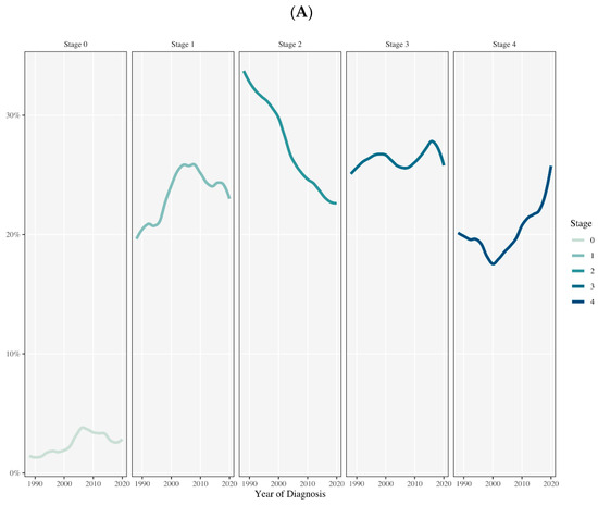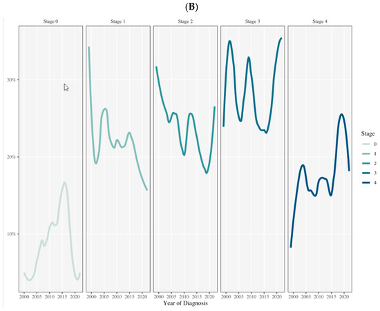 In the national database, the analysis shows a significant trend in the distribution of cancer stages at diagnosis over time (Figure 1A). There was an observed increase in the proportion of early-stage (Stage 0 and stage 1, z = 4.075, p < 0.001 and z = 3.3623, p < 0.001, respectively, by Mann–Kendall test), and late-stage (Stage 3 and stage 4, z = 1.8128, p = 0.035 and z = 3.7032, p < 0.001, respectively) cases, with a decrease in the proportion of Stage 2 diagnoses (z = −7.6697, p < 0.001). In addition, a significant regional trend in the distribution of cancer stages at diagnosis over time was noted (Figure 1B). There was a similar increase in the proportion of Stage 4 diagnoses (z = 1.9608, p = 0.025, and before 2020 z = 1.813, p = 0.035) with a decrease in Stage 2 diagnoses (z = −1.9624, p = 0.025, and before 2020 z = −0.7854, p = 0.037).