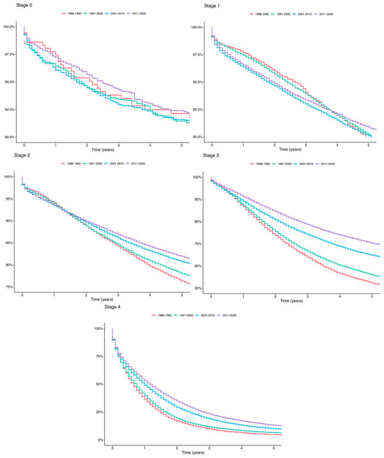 The staging of colorectal cancer (CRC) by the American Joint Committee on Cancer (AJCC) has been a cornerstone in guiding clinical decision making and prognosis. The AJCC staging takes into account the size and extent of the tumor (T), whether cancer cells have spread to nearby lymph nodes (N), and the presence of metastasis (M) [16,22]. From its first edition in 1977 to the current eighth edition, the AJCC staging system for colorectal cancer has incorporated significant changes to reflect a deeper understanding of cancer biology. Earlier editions focused primarily on the anatomical extent of the tumor, whereas recent editions have integrated molecular markers and genetic profiling that influence tumor behavior and, therefore, patient outcomes [10,12,14]. In the latest edition of the AJCC staging manual, CRC staging has been refined to capture the complexity of the disease’s progression. It maintains the established categories from Stage 0 (carcinoma in situ) through to Stage IV (metastatic disease), introducing substages in Stages II and III, which are based on tumor invasion depth (T4a vs. T4b) and the extent of nodal involvement N1 vs. N2. In addition, substages IVA, IVB, and IVC represent the spread of cancer to one distant site, multiple sites, or the peritoneum, respectively [16,22]. These distinctions allow for a more accurate prognosis and targeted treatment approach. To homogenize our patient’s population over the decades of this study, we simplified the staging of the CRC framework into stage 0: carcinoma in situ, stage 1: T1 with no lymph node involvement, stage 2: T2-T3 but has not spread to distant sites or lymph nodes, stage 3: regional lymph node involvement, and stage 4: metastatic disease.