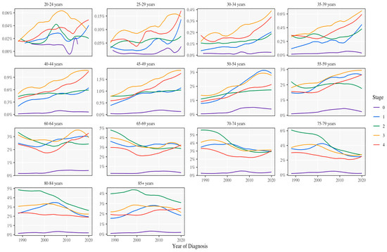 Trends in cancer incidence from Stage 0 to Stage 4 over time based on a national and regional database. The y-axis shows the incidence rate as percentage (%) by stage, and the x-axis shows the year of diagnosis. (A) There was a significant increase in the incidence of early (stages 0 and 1) and late stages (Stage 3 and 4), and a significant decrease in Stage 2 diagnosis (p < 0.01). (B) There was an increase incidence of late stage 4, and a significant decrease in the incidence of Stage 2 diagnoses (p < 0.05).
