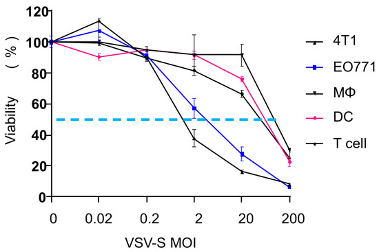 VSV-S infectivity in different cells. 4T1, EO771, macrophages, dendritic cells, and T cells were infected with VSV-S at different MOIs. Cell viability was measured 24 h after infection. The dotted line is drawn at 50% of viability.