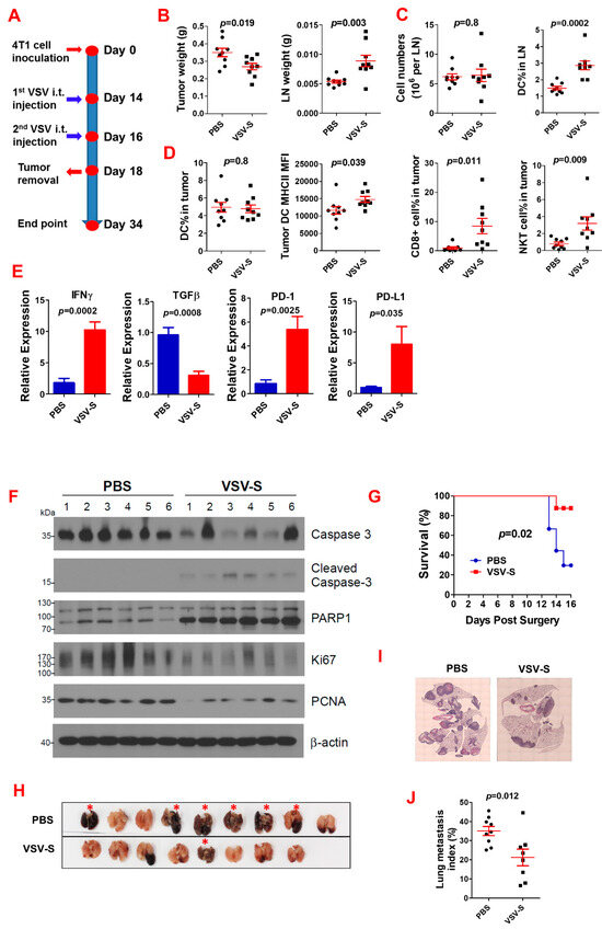 We first examined the impact of VSV-S as a neoadjuvant therapy on primary TNBC tumors and post-surgery cancer lung metastasis using a TNBC mouse model. The experimental design is shown in Figure 2A. Briefly, after 4T1 cell (2 × 105) inoculation in each side of the 4th pair of mammary fat pads of 8-week-old female BLAB/c mice on Day 0, two doses of VSV-S (dose = 2 × 106 PFU in 20 μL PBS for each tumor) were intratumorally (i.t.) injected on Days 14 and 16, the same volume of PBS was injected in control mice. The tumors were completely removed on Day 18, along with tumor-draining lymph nodes (LNs). The mice were then monitored for survival until Day 34. The lungs of mice that were euthanized at the endpoint or died before Day 34 were collected for analysis. VSV-S reduced the primary tumor weight and increased LN weight (Figure 2B). Flow cytometry analysis showed that VSV-S treatment increased dendritic cell (DC) numbers in LNs, while the total cell numbers in LNs were not different (Figure 2C). CD4+ T cells were not changed. Flow cytometry analysis also showed that VSV-S increased expression of MHC-II on DCs, and the number of CD8+ T and NKT cells in the tumors (Figure 2D). RT-qPCR revealed that IFNγ expression was increased while TGFβ expression was reduced in VSV-S-treated tumors; interestingly, VSV-S also significantly increased the expression of PD-1 and PD-L1 in the tumors (Figure 2E). The enhancement of apoptosis (increased cleaved caspase 3 and PARP1 levels) and reduction in tumor cell proliferation (decreased Ki67 and proliferating cell nuclear antigen (PCNA) levels) by VSV-S treatment were demonstrated by Western blot analysis of tumor tissues (Figure 2F). Survival analysis showed that VSV-S significantly improved mouse survival (Figure 2G). In the VSV-S-treated group, only one mouse among the eight mice died before the endpoint, with a long median survival of over 34 days, whereas in the PBS control group, six mice among the nine mice died before the endpoint, with a median survival of 14 days. Examination of the lungs shows that mice died before the endpoint due to severe cancer lung metastasis (Figure 2H–J). In a previous study, we showed that VSV-S treatment also reduced numbers of tumor-associated macrophages (TAMs), and myeloid-derived suppressor cells (MDSCs) [21].