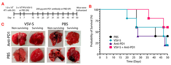 To establish a metastasized model, Balb/c mice (6 weeks, female) were purchased from Jackson Laboratory (Bar Harbor, ME, USA) and acclimated for one week. On Day 0, the mice were injected intravenously (IV) in the lateral tail vein with 1.0 × 106 of the 4T1 cells that were quantified with a Hausser Brightline hemacytometer (Horsham, PA, USA). The mice were then divided into 4 treatment groups (n = 5). On Days 5 and 7, the mice received 30 μL of either 3 × 106 PFU VSV-S (VSV-S or group 1) and VSV-S + anti-PD1 (group 2) or PBS (anti-PD1 or group 3) and PBS (group 4) intranasally (IN). On Day 15 and every 4 days after that, the mice received an intraperitoneal (IP) injection of 60 μL per mouse of either 200 μg of anti-PD-1 antibody (antibody purchased from BioXCell, RMP1-14, Lebanon, NH, USA) for groups 2 and 3 or PBS for groups 1 and 4. The mice were monitored daily and were weighed every other day. The mice were euthanized if they lost significant body weight, had tumors greater than 2 cm in any one dimension, or turned necrotic.