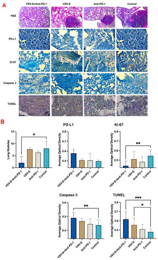 To better evaluate the metastasis of the tumor cells in the lung, immunohistochemistry staining (IHC) and terminal deoxynucleotidyl transferase dUTP nick-end labeling (TUNEL) assays were performed (Figure 4). PD-1 is mainly expressed on T cells, whereas PD-L1 is expressed on cancer cells and antigen presenting cells [26]. Combination therapy increased the expression level of PD-L1 compared to the monotherapies and the control group. The proportion of the proliferation marker Ki-67 was significantly reduced following the combination therapy compared to the control group. The combination therapy group has higher caspase-3 levels than the monotherapy group, or the control group, indicating the induction of apoptosis [27,28]. Furthermore, there was a significant increase in positive TUNEL staining in both the VSV-S-treated group and the combination therapy group. All the data above prove that the combination therapy induced apoptosis in the tumor and decreased the metastasis in the lung.