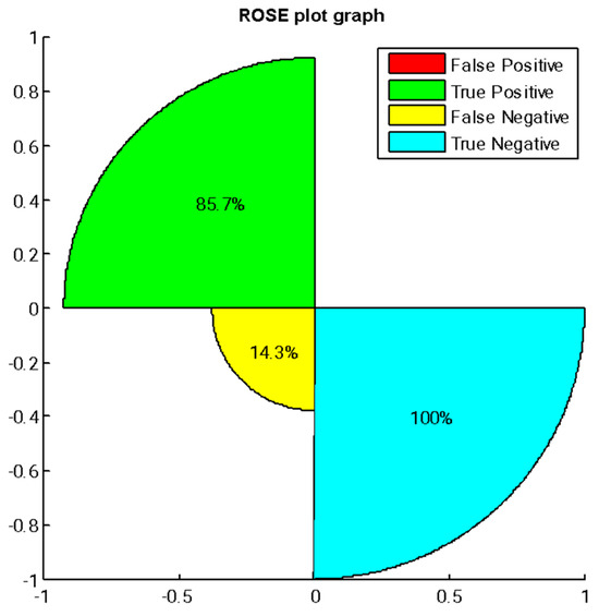 Figure 1 represents a rose-plot graph, where we illustrated the percentages of true negative (100%), true positive (85.7%), false negative (14.3%), and false positive (0.0%). For the rose-plot, we used the area of segments of the circle to convey amounts, where the angle is constant i.e., divided 360 by the number of parameters considered thus, the square root of the radius is proportional to percentages.