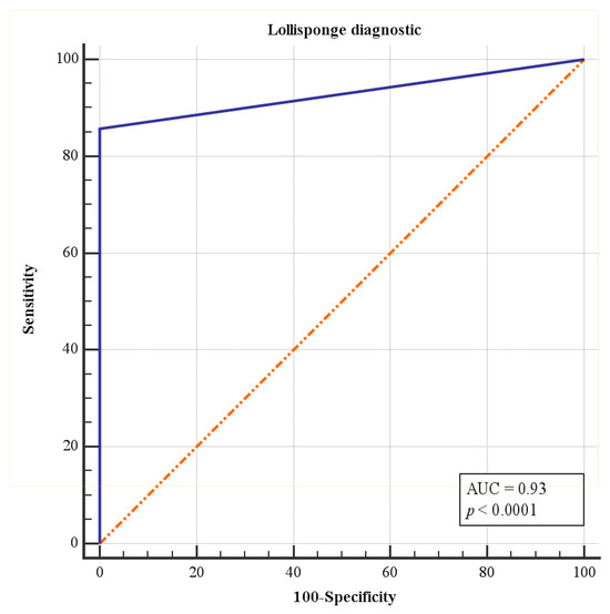 To obtain a complete sensitivity/specificity report, the Operating Characteristic (ROC) curve analysis was applied. Particularly, the graph reported the area under the ROC curve (AUC) and compared to the area under the red line equal to the value 0.5. Figure 2 presents the area AUC associated with the LolliSponge diagnostic performance which was significantly greater than 0.5 (0.93 vs. 0.5, p < 0.0001).