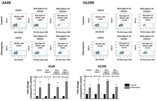 Flow cytometry images and analysis of CD133 and HLA-class-I-positive cells, and HLA-class-I-positive cells in either CD133-negative and -positive subpopulations of A549 and H1299 lung cancer cell lines, respectively, exposed to 10 μΜ of chloroquine (** p < 0.01, *** p < 0.001). Bars show the mean values and standard deviation. Percentages reported refer to the mean values.