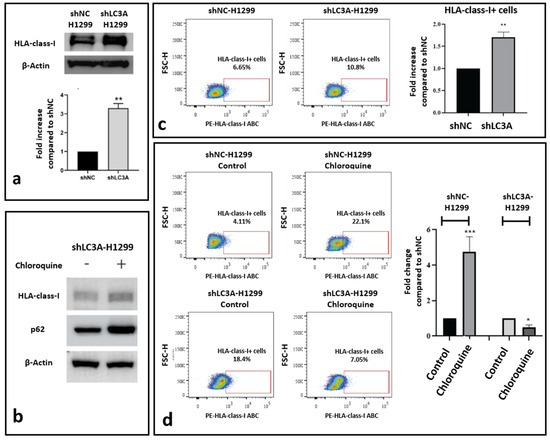 Flow cytometry also revealed increased levels of HLA-class-I protein in shLC3A- H1299 lung cancer cells compared to the shNC-H1299. The percentage of HLA-class-I-positive cells was 6.65% and 10.8% (1.7-fold higher; p < 0.01), respectively (Figure 3c). Exposure to chloroquine resulted in a strong increase in the percentage of positive cells in the shNC-H1299 cell line (4.11% to 22%; 4.83-fold increase; p < 0.001) but had no stimulatory effect on the shLC3A-H1299 cells, where the levels decreased from 18.4% to 7.05% (2.06-fold decrease; p < 0.05), as shown in Figure 3d.
