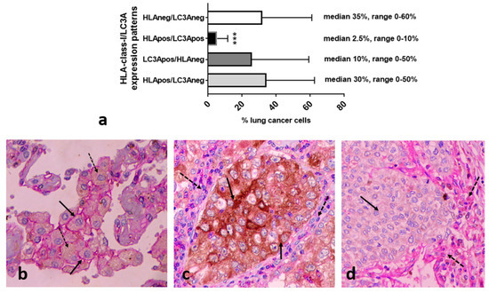 The analysis of 27 non-small cell lung cancer cases, stained with double immunohistochemistry for LC3A and HLA-class-I, showed that the LC3A+/HLA+ cancer cell population was by far less conspicuous compared to the ones with the other three expression patterns (p < 0.01; Figure 4a). Figure 4b–d show a typical double immunostaining showing the simultaneous expression of LC3A/HLA-class-I, single staining patterns, and a lack of expression.