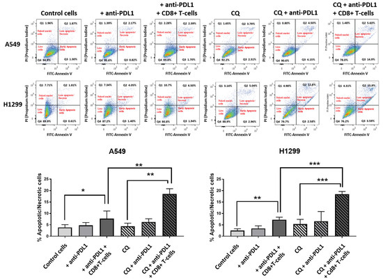Analysis of apoptosis/necrosis in H1299 cells in control cells after incubation with anti-PD-L1 MoAbs, after pre-incubation with anti-PDL1 MoAbs followed by co-culture with activated CD8+ T-cells, after exposure to chloroquine, after incubation with chloroquine and anti-PDL1 MoAbs, and after pre-incubation with chloroquine and anti-PDL1 MoAbs followed by co-culture with activated CD8+ T-cells (* p < 0.05, ** p < 0.01, *** p < 0.001).