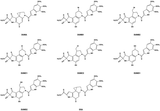 The stability of the different duocarmycins has been studied in relation to their cytotoxicity and antimicrobial activities [34]. These compounds include duocarmycin A and SA, which have a spirocyclopropylhexadienone moiety, and four halogenated seco-compounds of duocarmycin A: duocarmycin B1, B2, C1, and C2, from which the cyclopropane ring structure is absent. The cytotoxic activity was investigated using Balb 3T3/H-Ras cells after 72 h drug exposure. Results showed that duocarmycin analogs induced cytotoxicity, as determined by inhibitory concentrations that inhibited 50% cell growth (IC50 (nM)) as follows: DSA (0.05) > DUMA (0.3) > DUMB2 (1.5) > DUMB1 (3.0) > DUMC2 (20) > DUMC1 (40) [34].