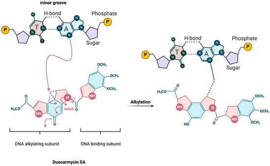 The duocarmycin family of compounds are characterized by their ability to bind within the minor groove of DNA (the shape-dependent catalysis indicated by the “twist” in the figure) and alkylate adenine residues, as illustrated by DSA (Figure 2). However, each of these analogs has variations in their molecular structures that confer different degrees of stability, reactivity, or specificity. These variations often occur in the DNA-binding unit, a subunit-linking amide, or the alkylating unit, which significantly influence their biological activity and therapeutic potential [24,30,31,32].